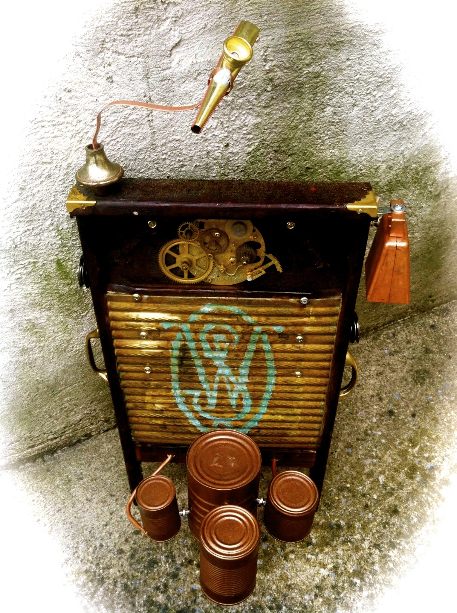 Every now and then I like to branch out of the stringed instrument world. Here is a washboard I designed and built for the Way Station. Patina Way Station logo on the copper face. Attached cowbell, kazoo holder and soup cans.