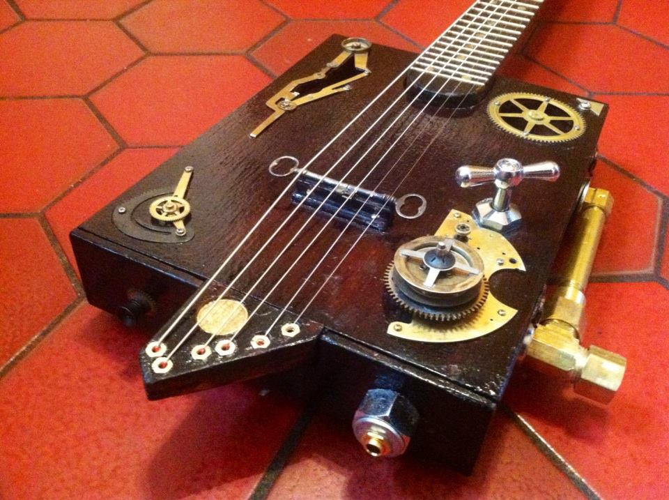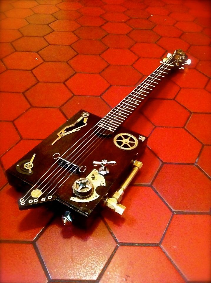 The Brooklyn Doctor Who themed bar, the Way Station, commissioned this steampunk cigar box guitar. It’s a Davidoff Double R box decked out with a spigot volume knob and a clockwork tone knob. Skeleton key bridge. Copper piping. Spent .22 bullet shell fret markers. Clock gear side fret markers. Gold frets and hardware. Maple neck. Red oak fingerboard.