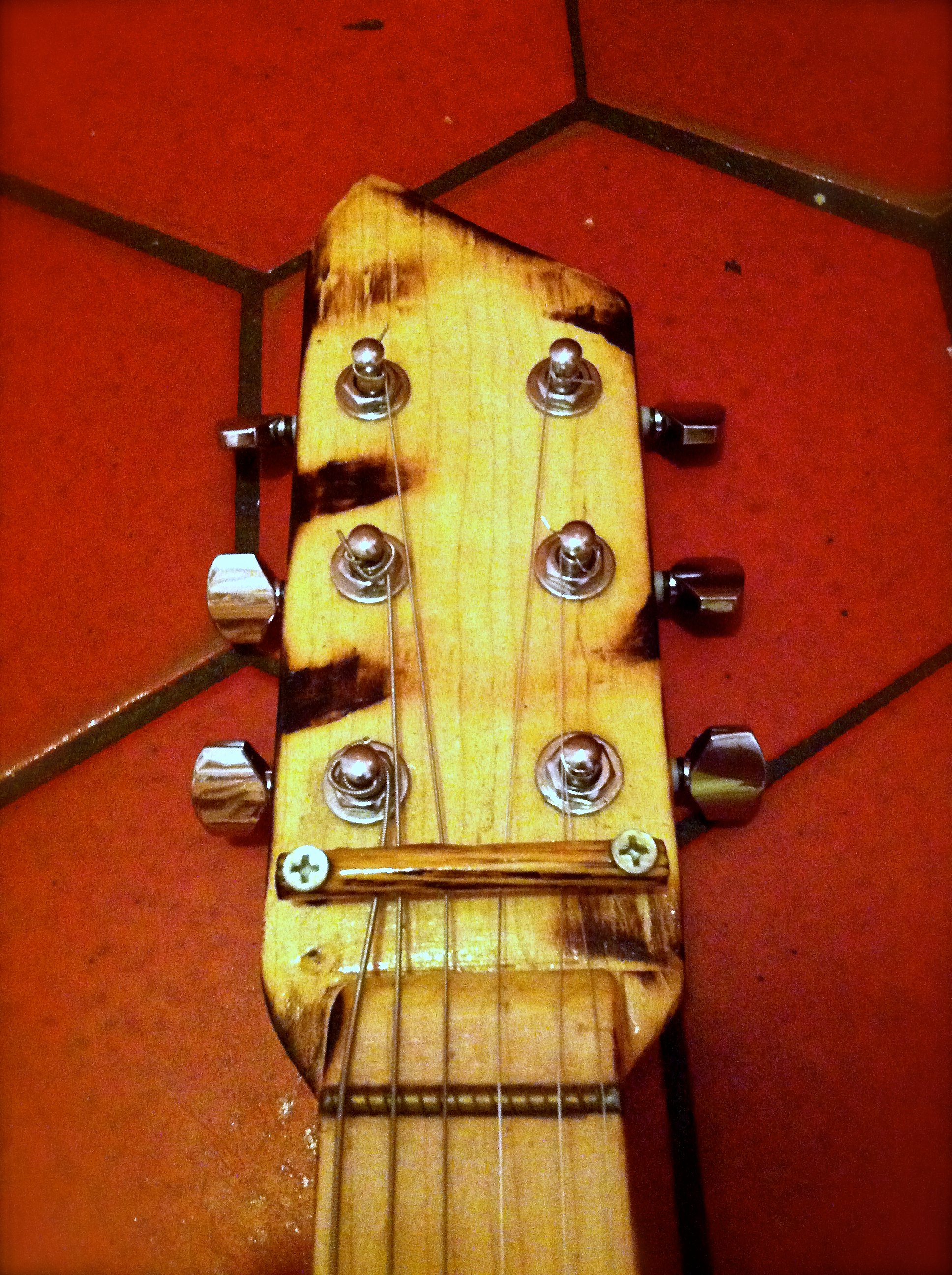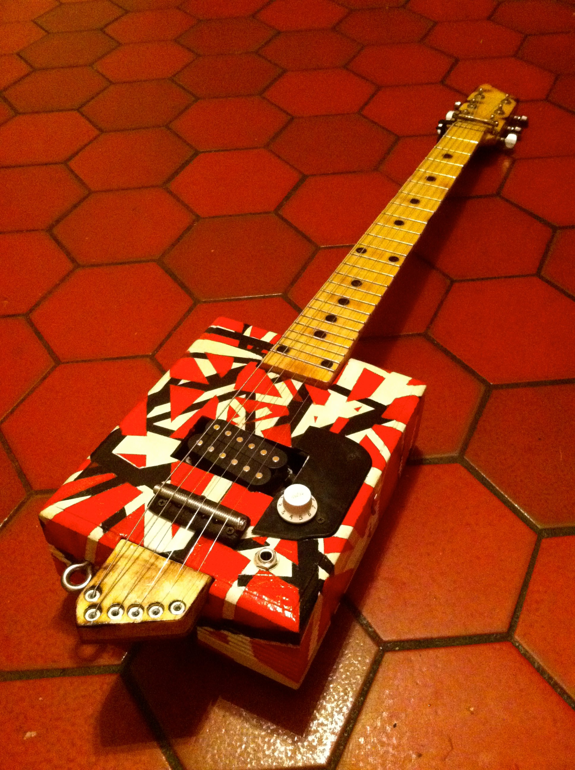This was a commission by a shredder who wanted an old world version of Eddie Van Halen’s legendary Frankencaster. This guitar includes custom paint job, humbucker in the bridge position, single volume control w/tone knob, cigarette burns in the headstock, reflectors on the back, O bolt strap “buttons,” and a monster sound.