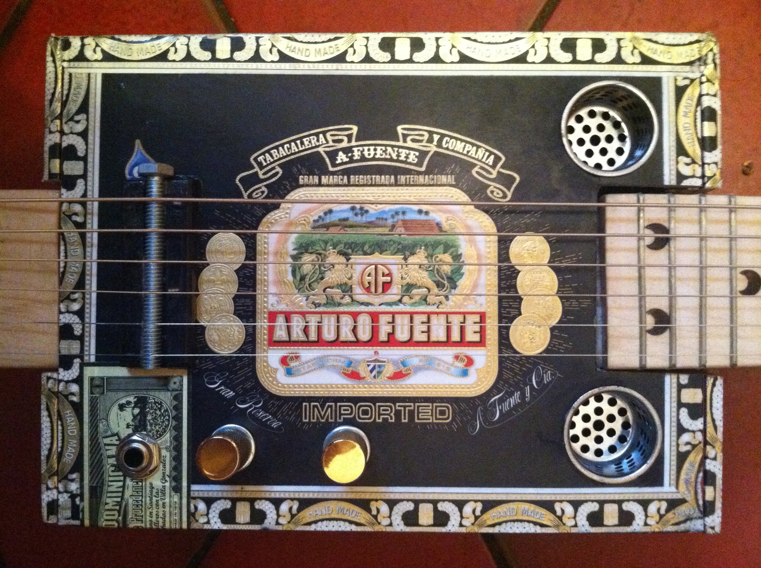 December 18, 2013 by fivepointsinstruments King Arturo ~ 6 String Guitar Arturo Fuente Gran Reserva Chateau Fuente Pyramids 6 string guitar Maple neck and fingerboard Piezo pickup w/volume and tone controls Share this: Click to share on X (Opens in new window) X Click to share on Facebook (Opens in new window) Facebook Like Loading... Related