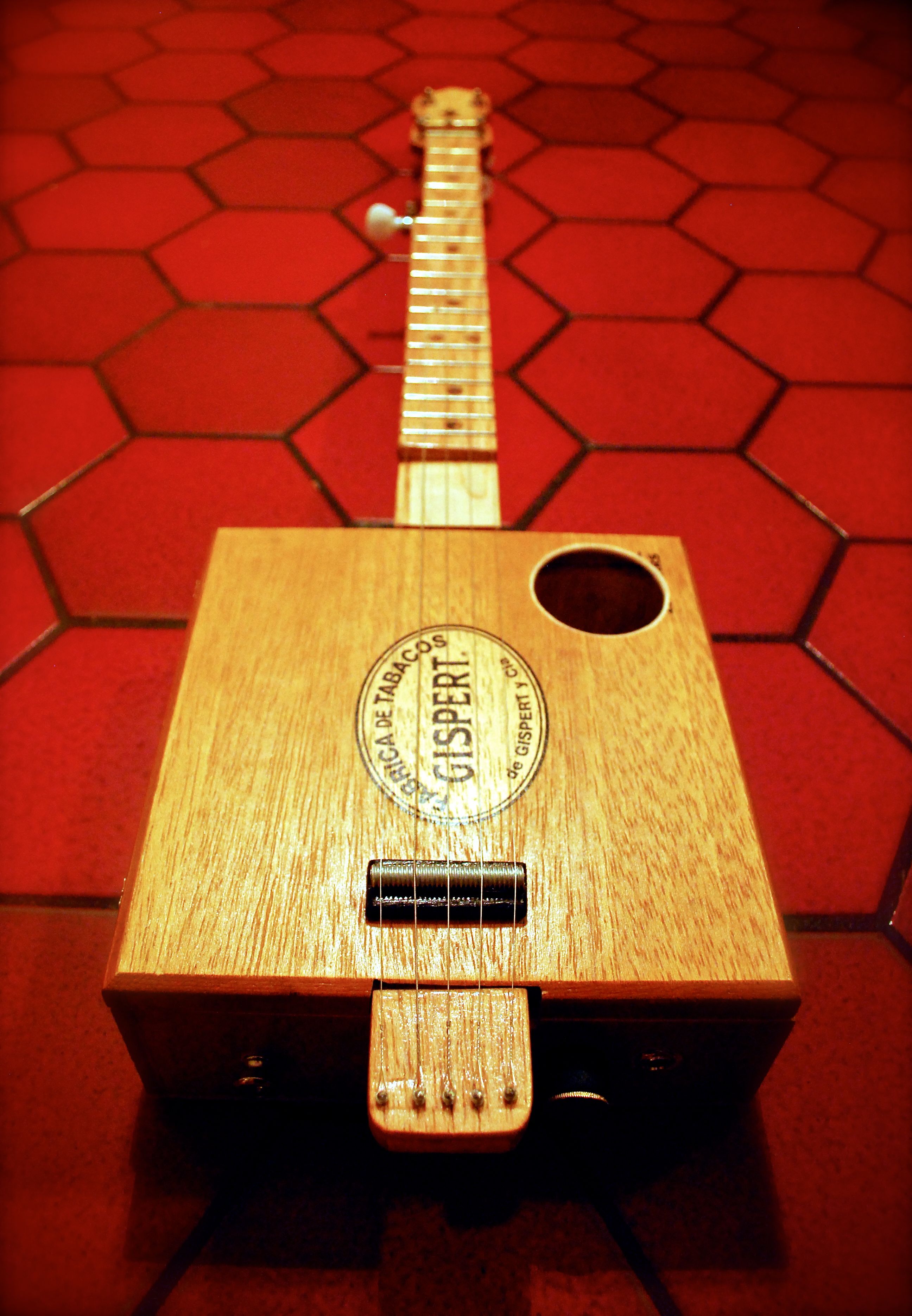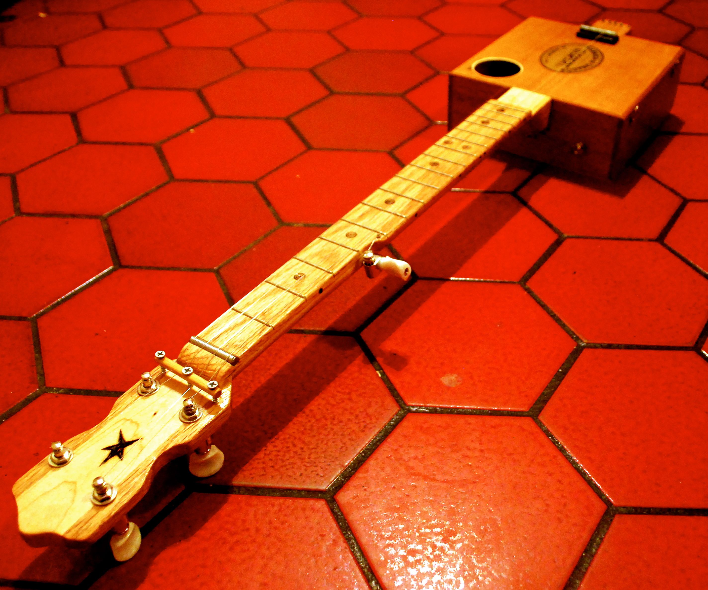 The first 5 string cigar box banjo has arrived. 24 3/4″ scale, maple and red oak neck/fingerboard, piezo pickup with volume control. I recently had the pleasure to be a part of the NYC workshop of BRIGHT STAR, a new musical by Steve Martin and Edie Brickell. One day during a lunch break, Mr. Martin was plucking away at his banjo when I handed this little beauty to him. He grabbed it and started to pick away. It was wonderful hearing a true master playing this thing. He said it played really well. That’s all I needed.