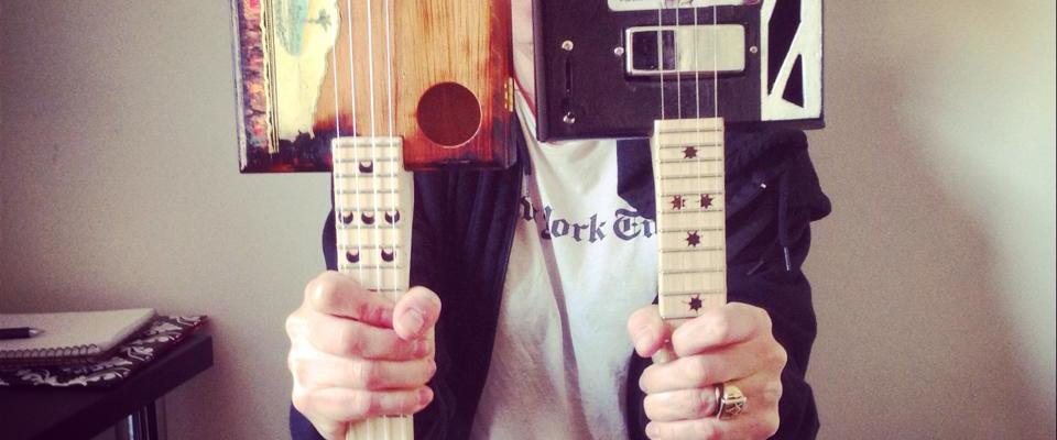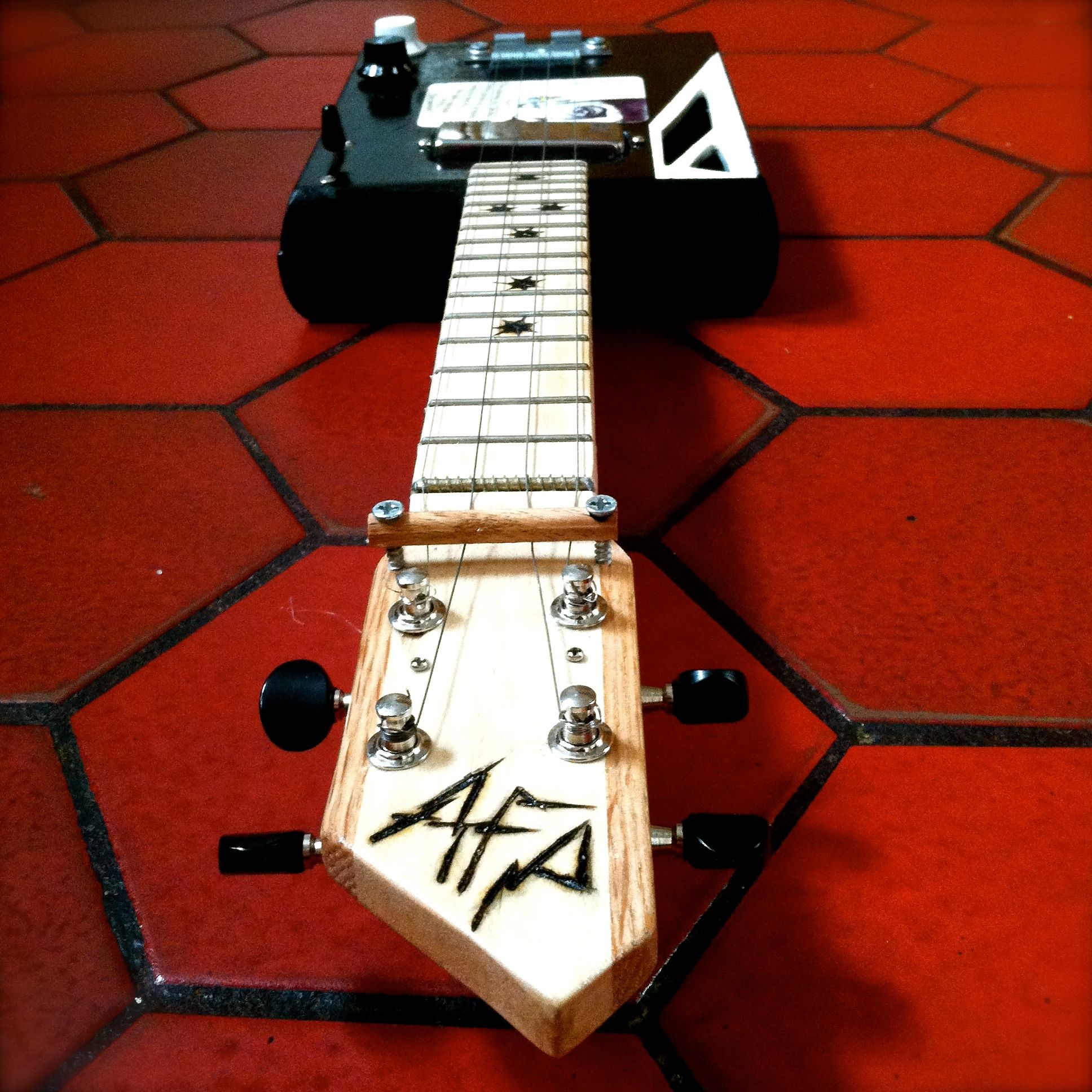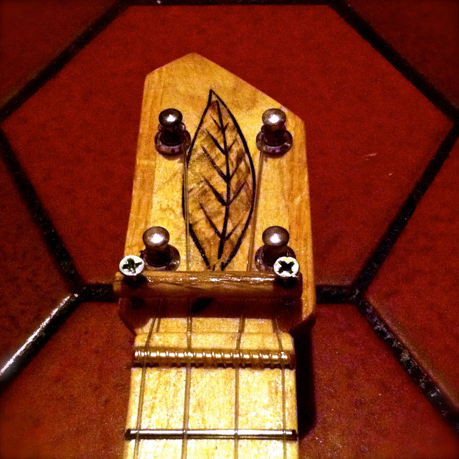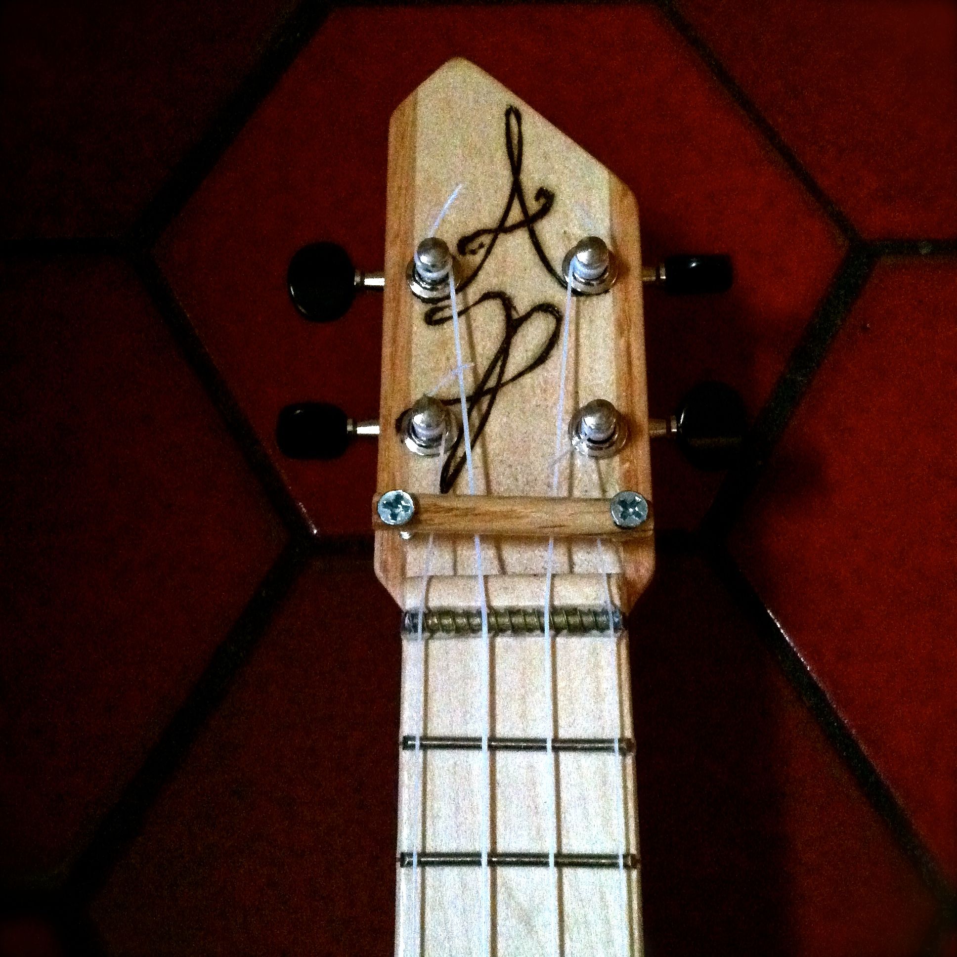 Next is a punk rock screamer made from a Rocky Patel 7Year box I painted with a retro art deco design. This little beast has steel strings, a piezo under the bridge for a tight, gentle sound, and a mini hum bucker in the neck position for a thick, rumbling, punk rock uke tones. You know, for when you want to shred on a soprano ukulele. It also has a three way selector switch along with volume and tone knobs for a variety of sounds.