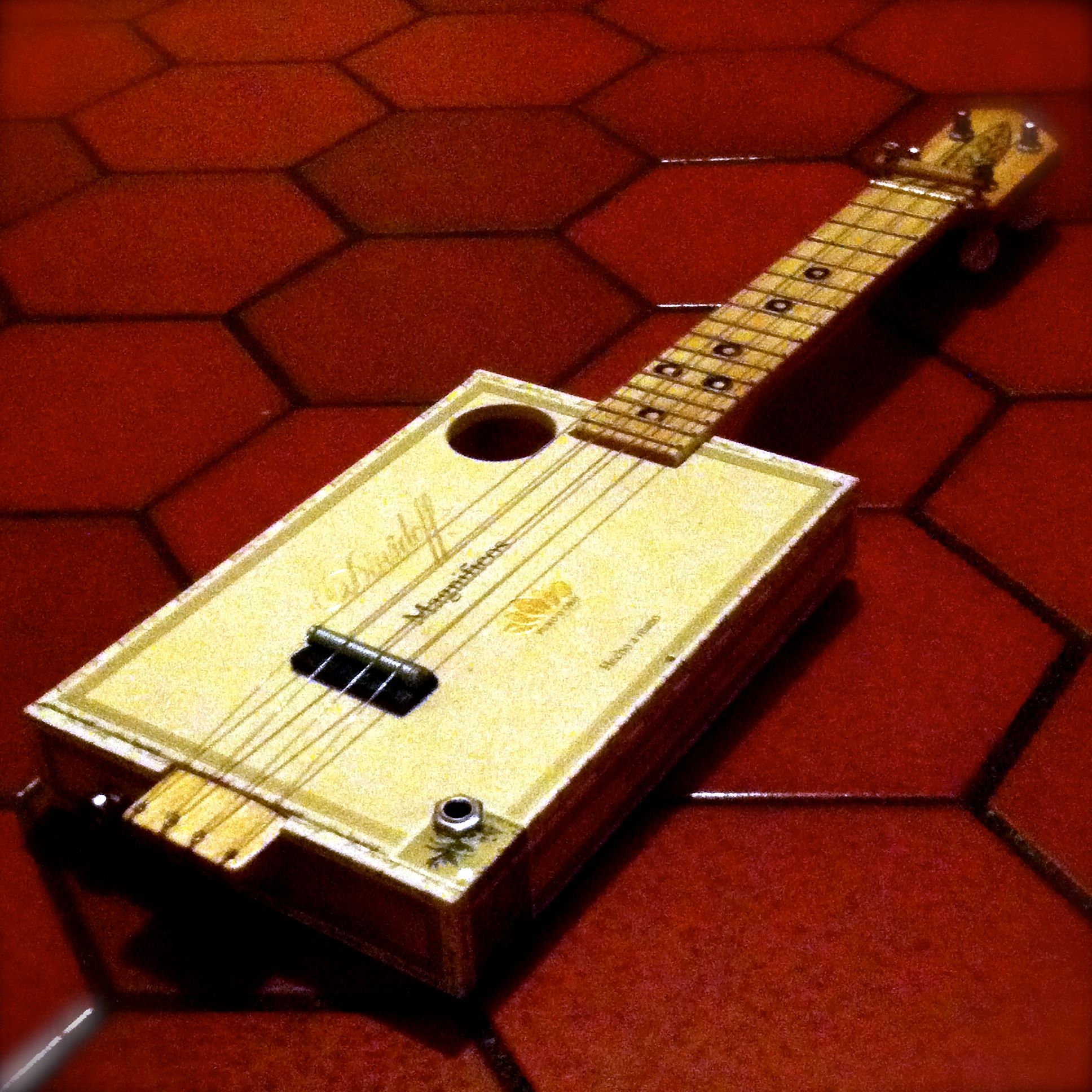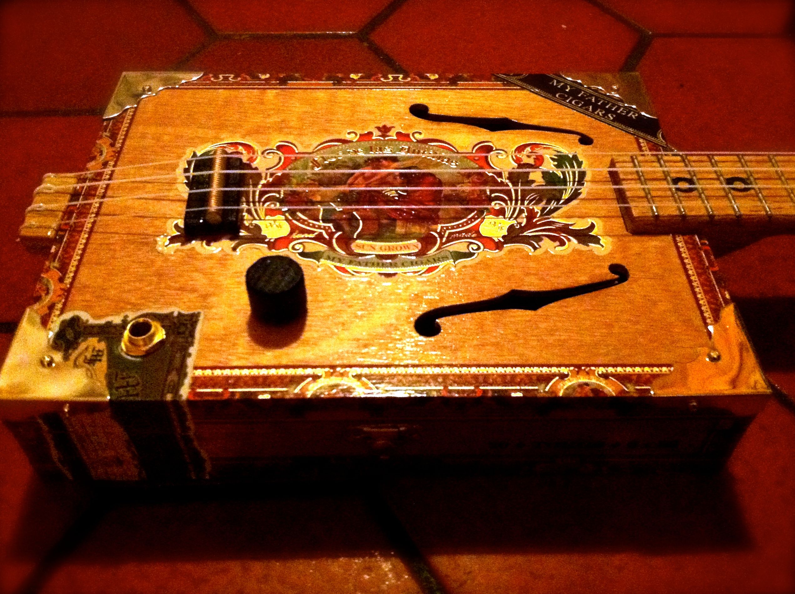 Finally, to finish off uke month, we have Magnifico, a soprano uke made from a Davidoff Magnifico box, and L’il Papa, a tenor uke made from a beautiful My Father’s Cigars box. Both have electronics, of course, and L’il Papa has a volume control.