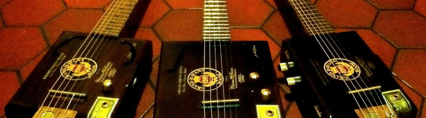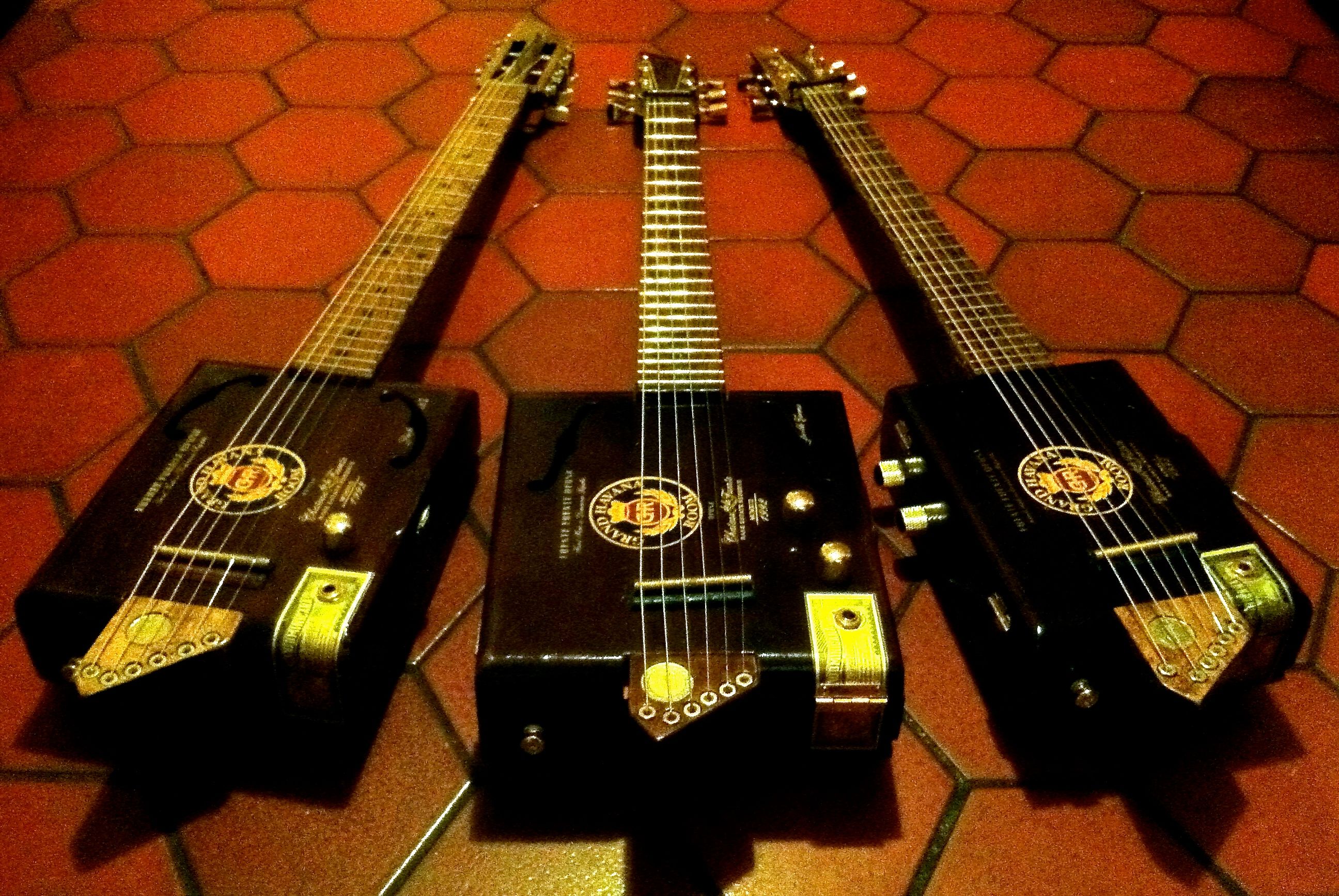 Apparently, Grand Havana Room owner Stan Shuster liked the NYC GHR cigar box guitar so much that he abducted it back to his home in California. Hence, the NYC club needed a new axe and Mr. Shuster asked for two others to be sent to Cali. It was a delight to build this trio out of beautiful Arturo Fuente Opus X boxes. Each one is unique, but they are all of the same classy family.