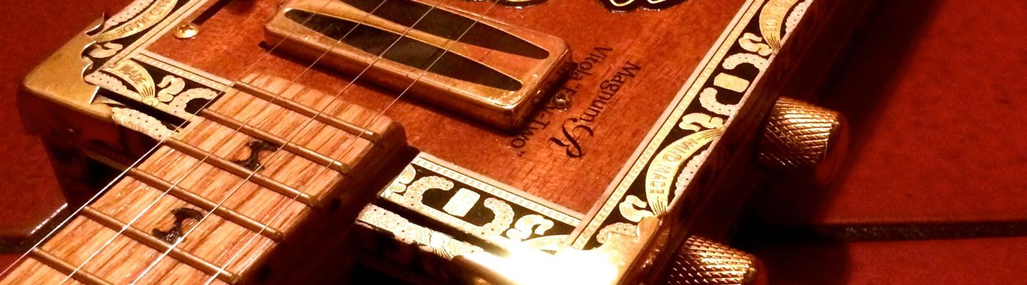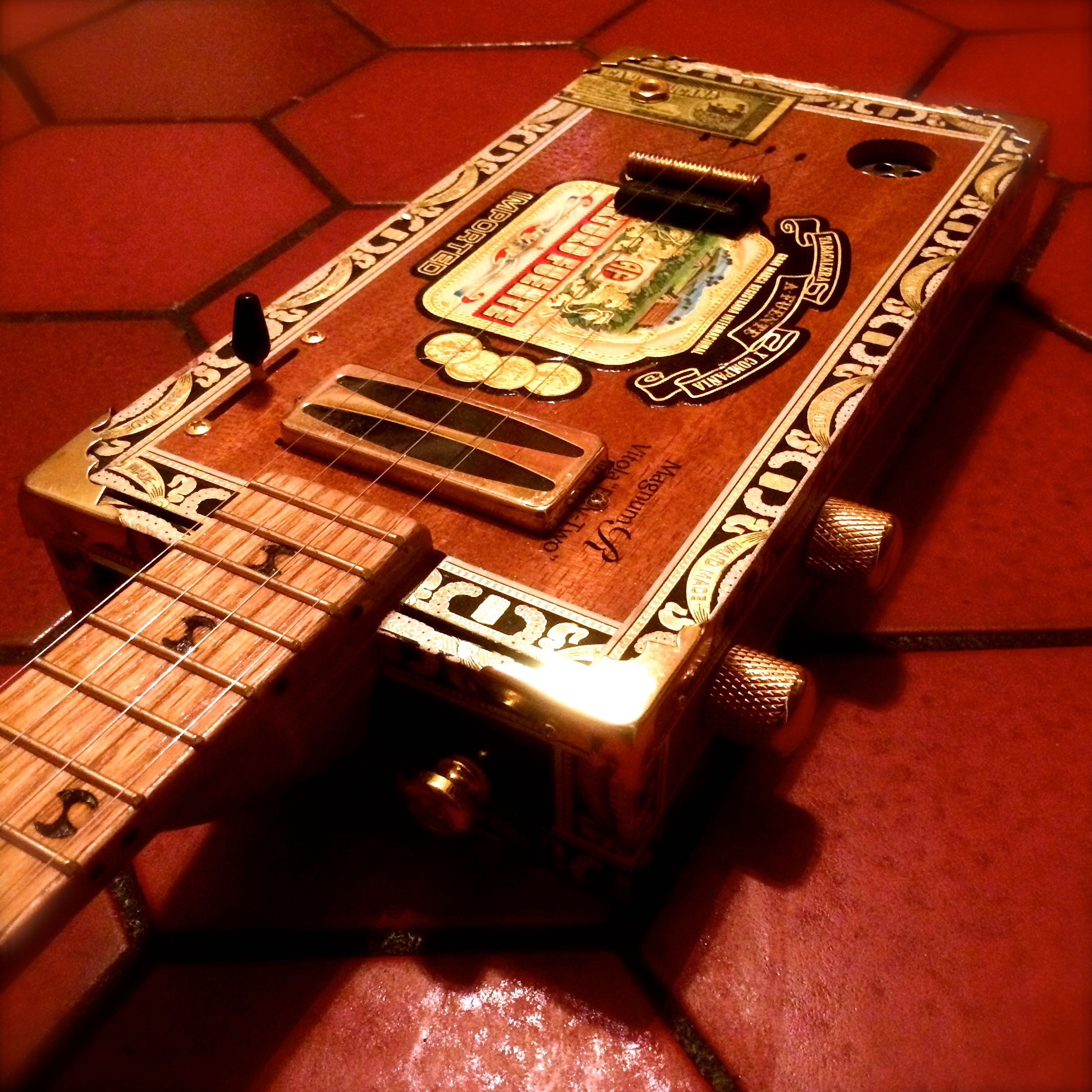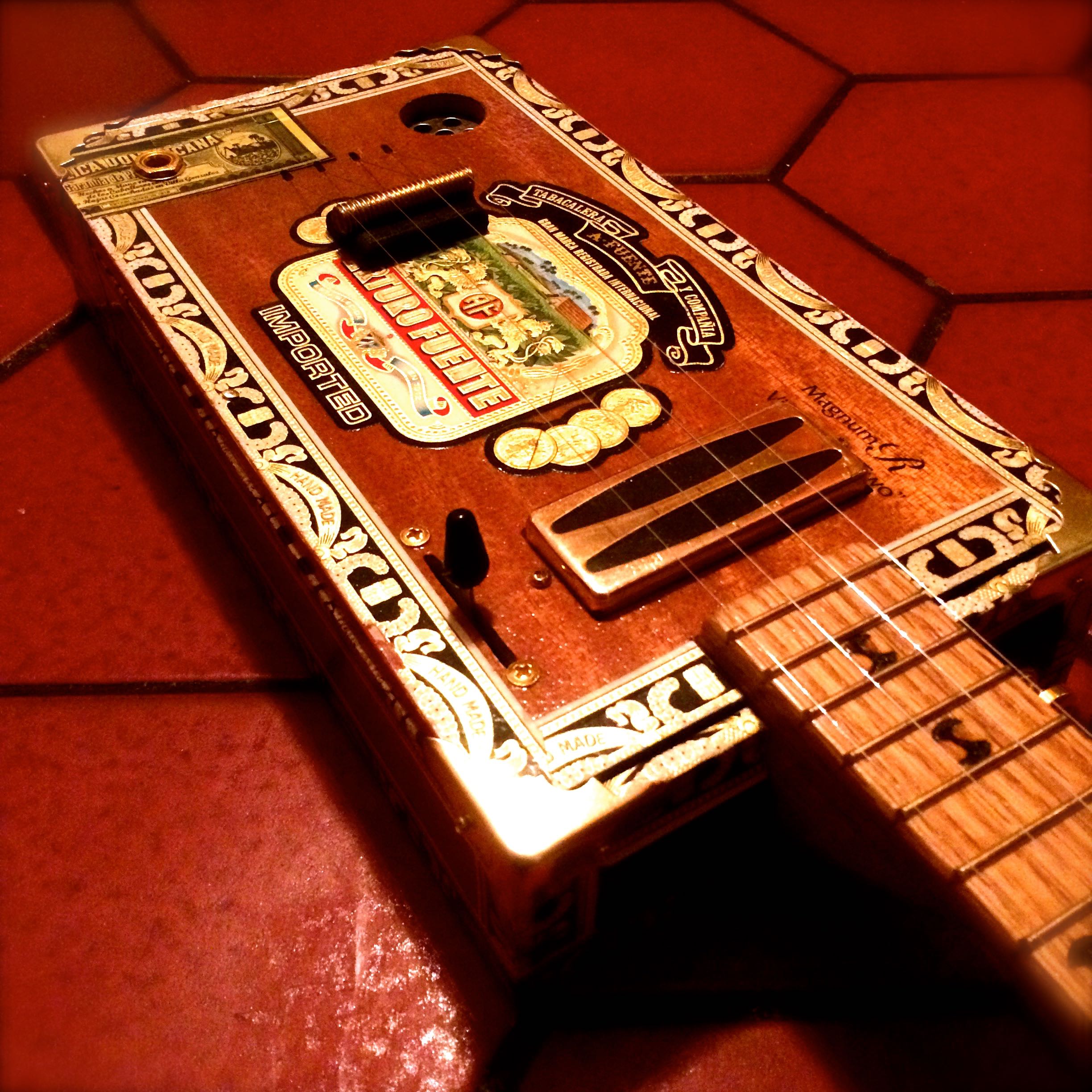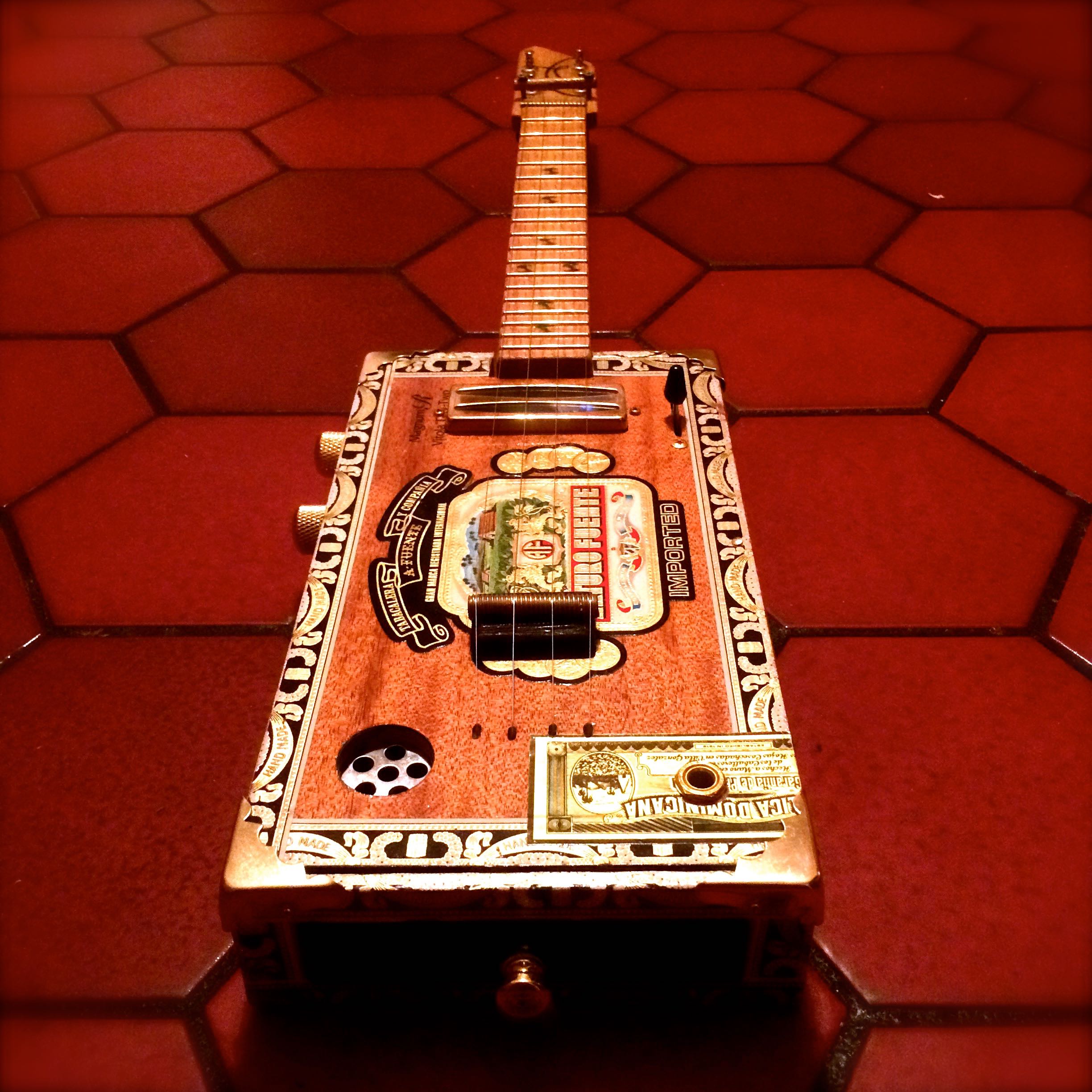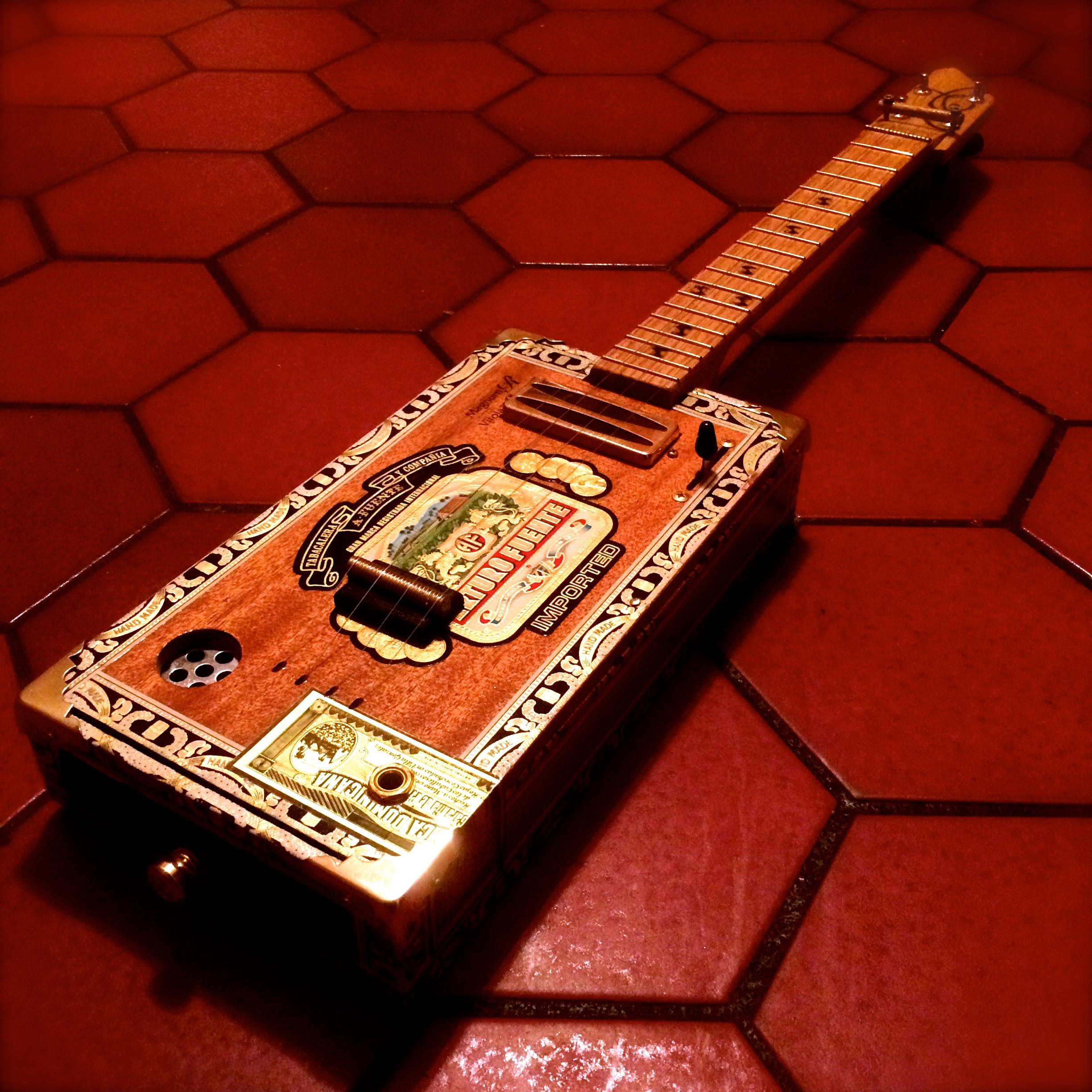 The Electrouke has an 18″ scale, mini hum bucker in the neck position, piezo under the bridge, 3 way selector switch, gold hardware and volume/tone controls. The sound ranges from super bright acoustic tone to ringing clarity with the piezo and growling thunder with the hum bucker. Aside from the great sound, it is a real eye-catcher with it’s red/black/white/gold Arturo Fuente box.
