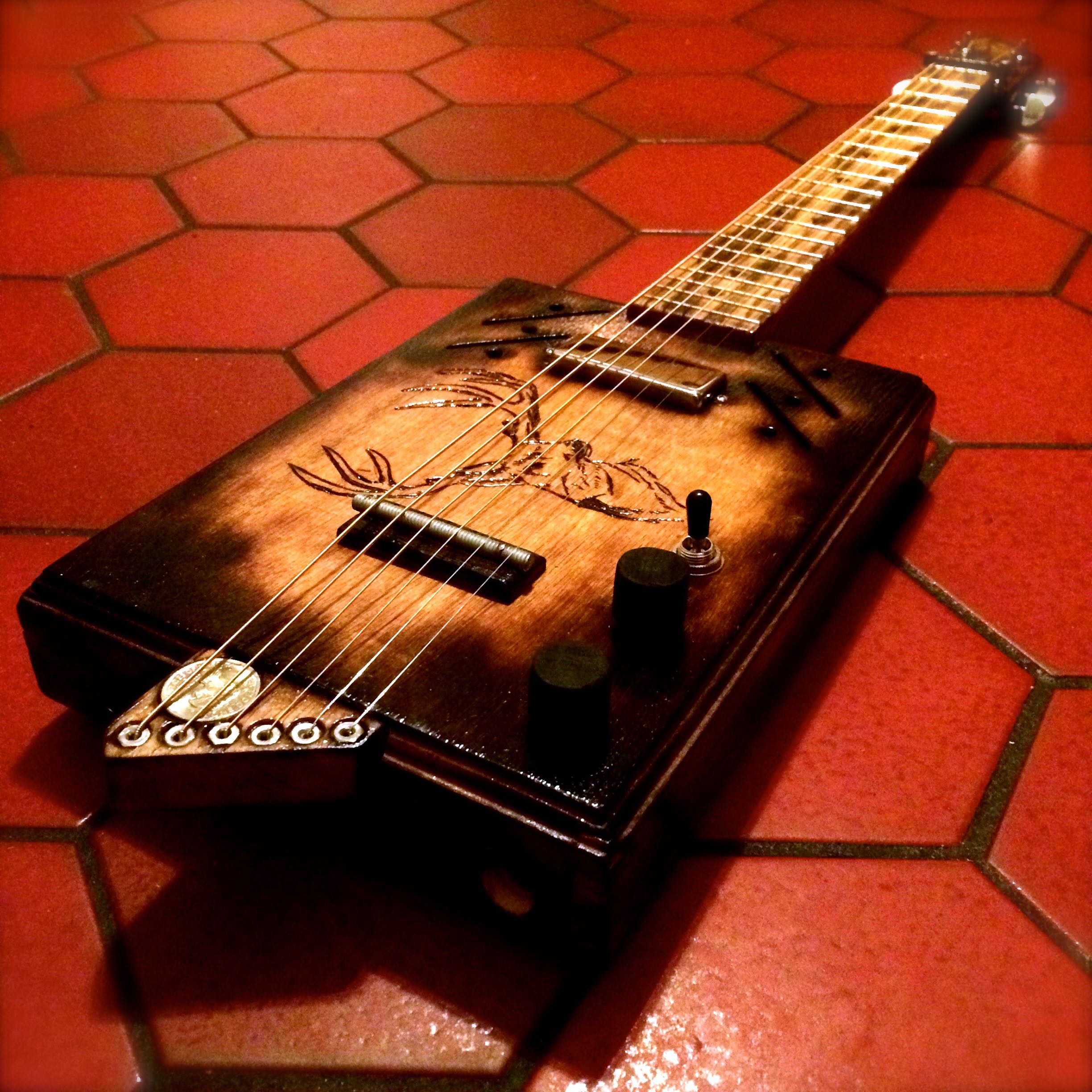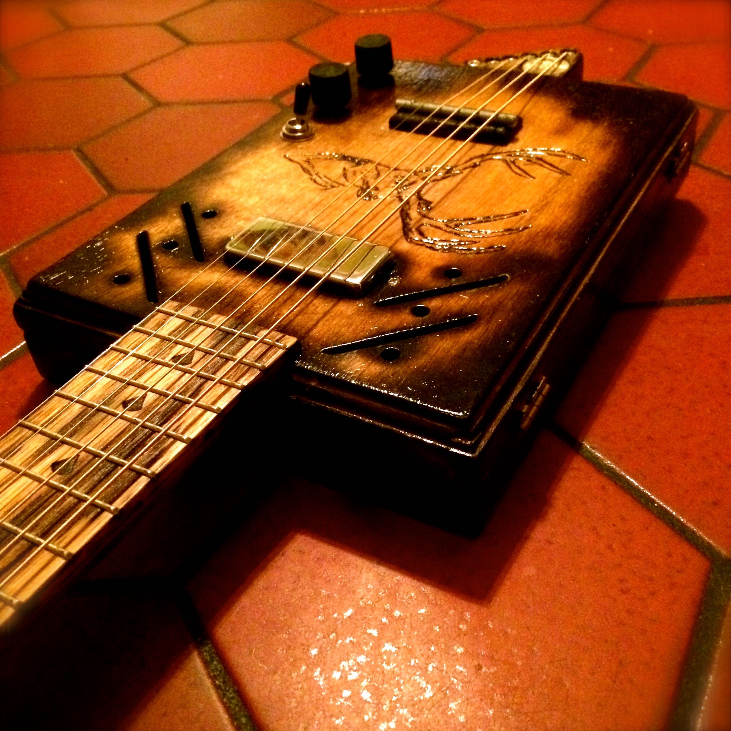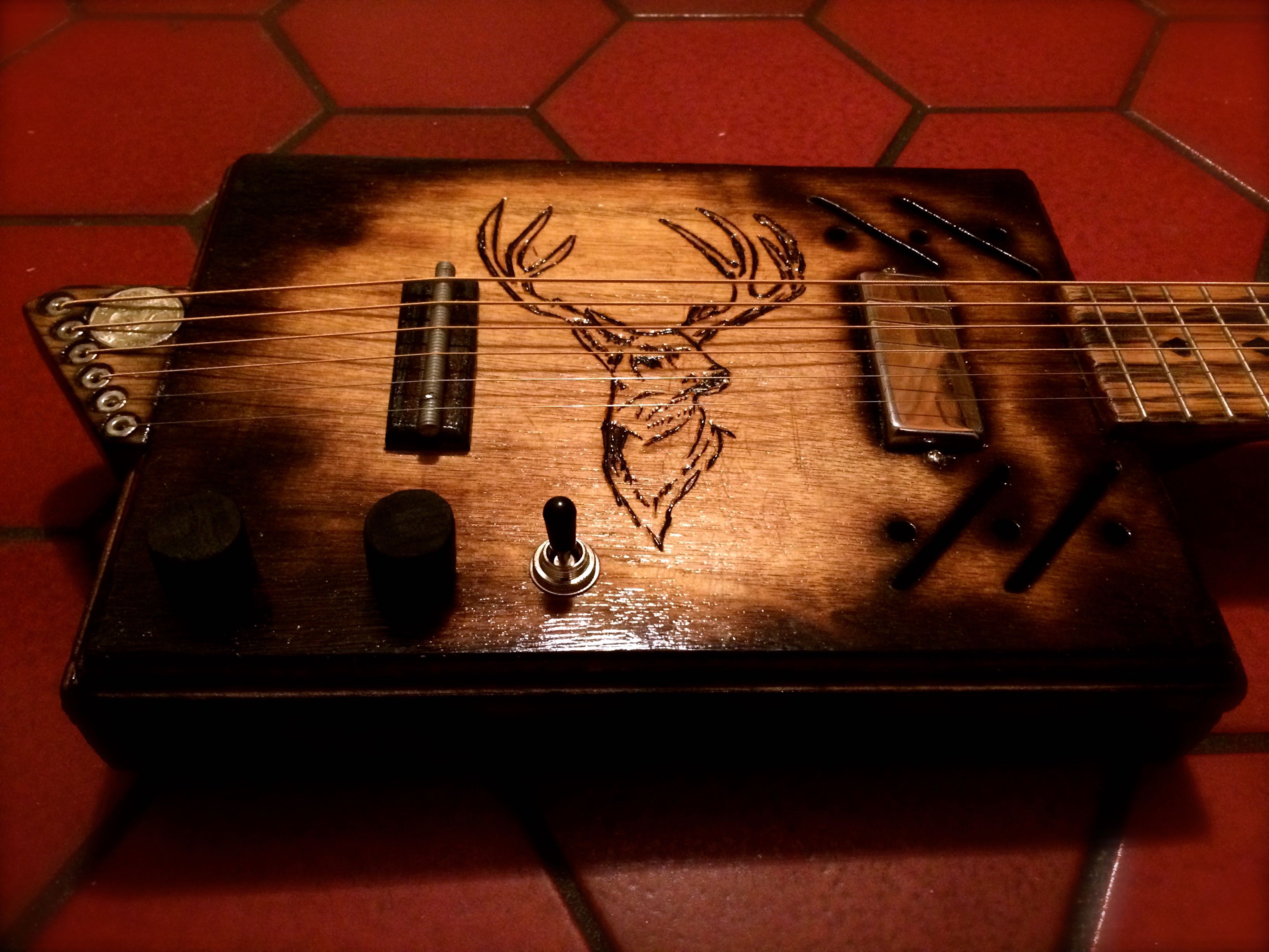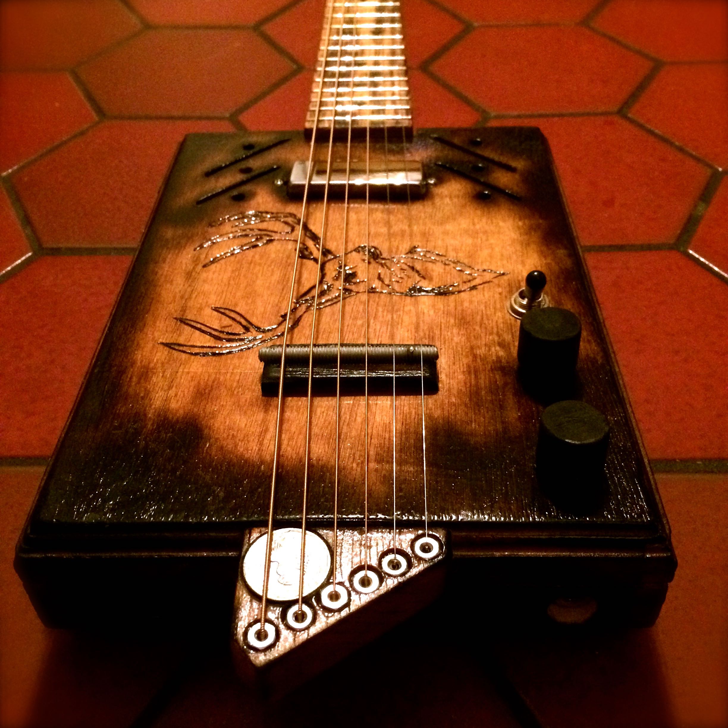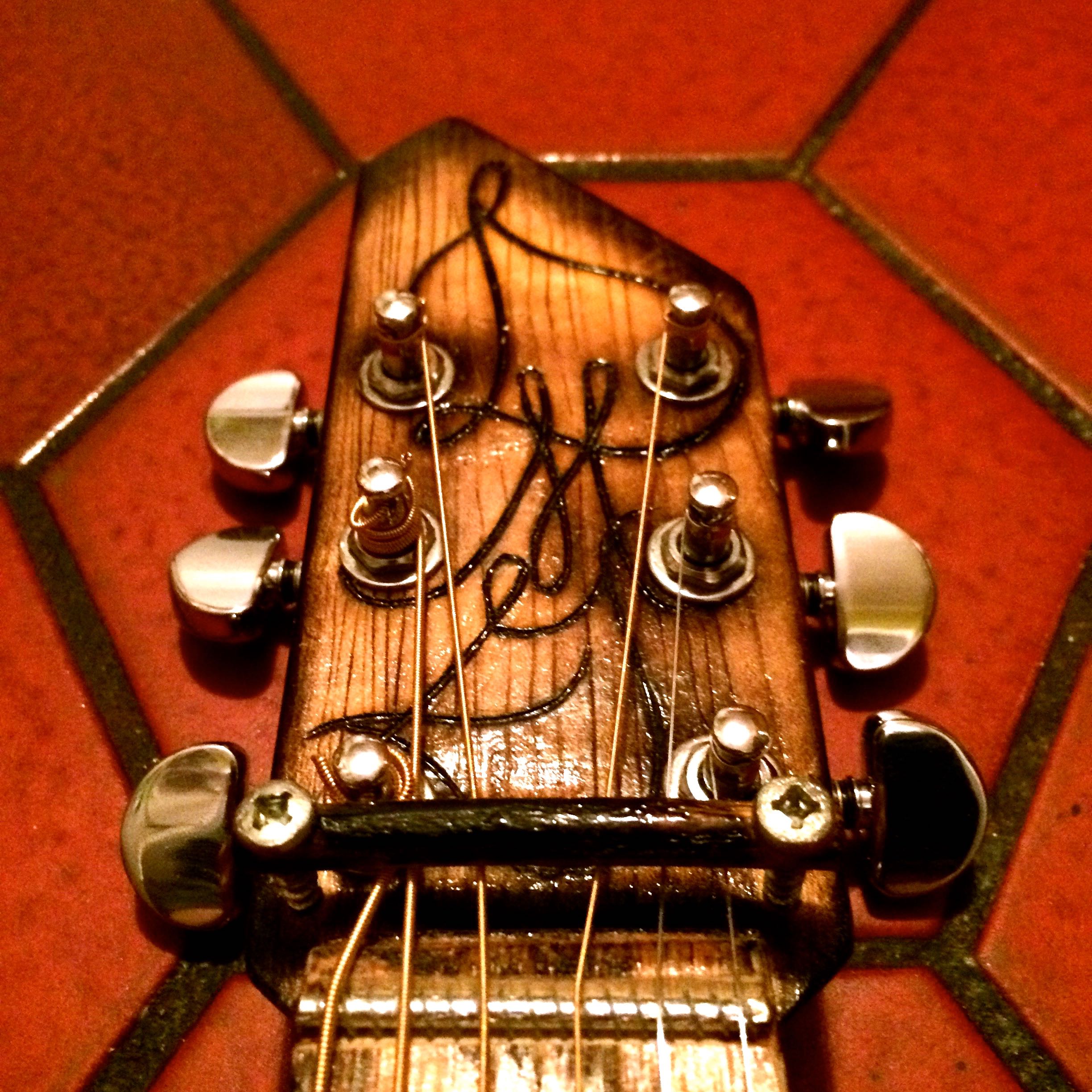 Here’s a beauty built for a nature photographer. I was thinking of a log cabin in the woods when I started working on this piece and thought a wood burnt stag would make a nice centerpiece on this charred soundbox. A mini hum bucker at the neck, piezo under the bridge, three way toggle switch, volume and tone controls make this guitar sing with a wide variety of voices.