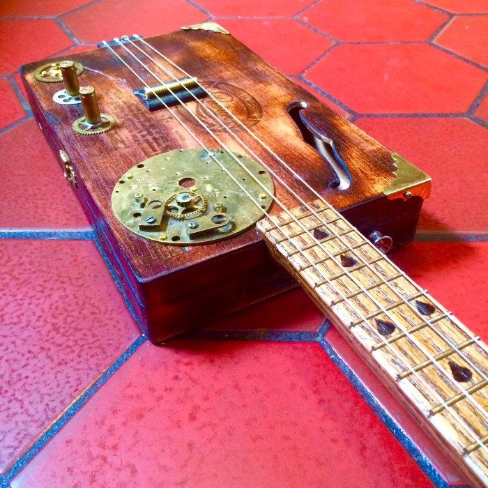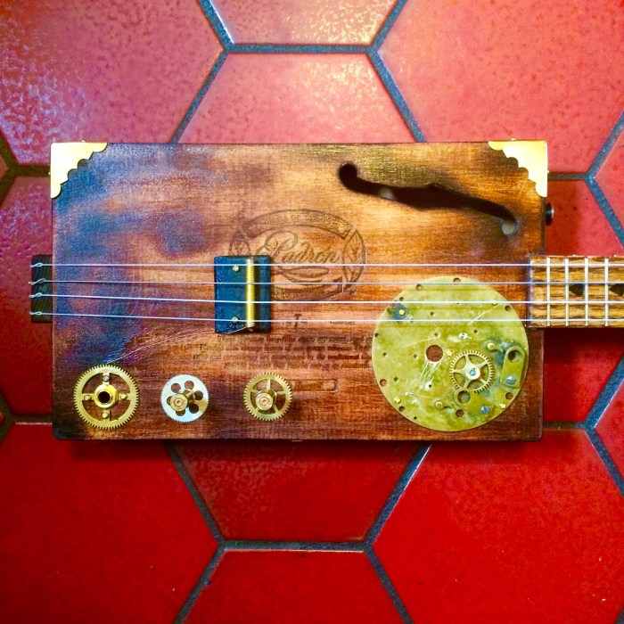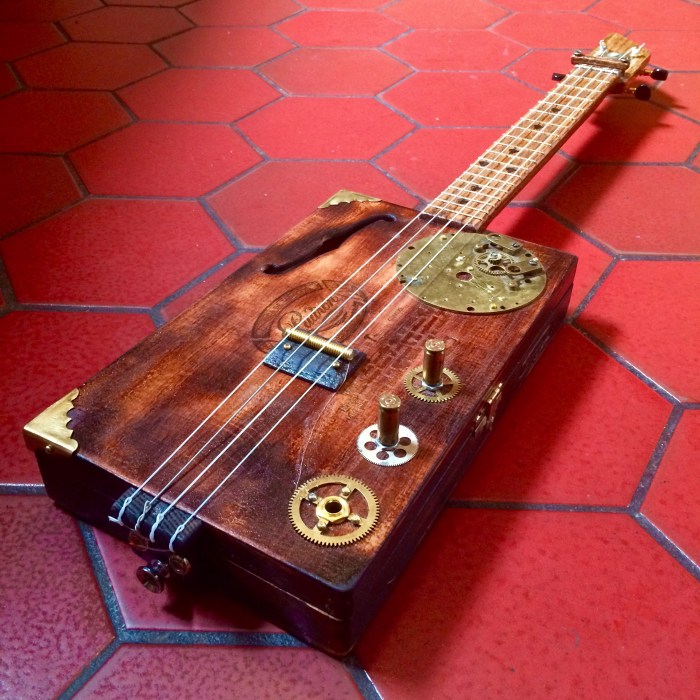 April 30, 2016 by fivepointsinstruments Time Machine A tenor uke with an old time look. Piezo pickup with volume and tome controls and bullet casing knobs, for the steampunk inside us all. Share this: Click to share on X (Opens in new window) X Click to share on Facebook (Opens in new window) Facebook Like Loading... Related