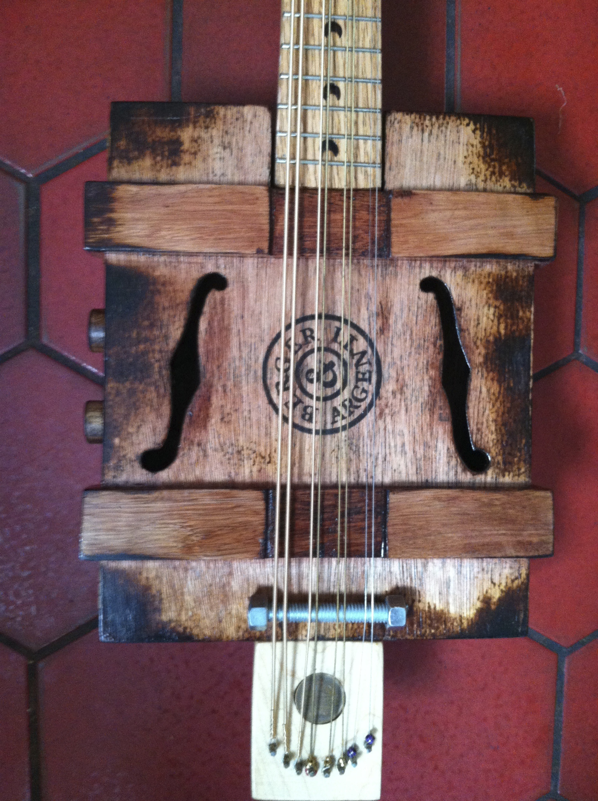 This is a mandocello commissioned by Andy York, guitarist for John Mellencamp, Jason & the Scorchers, Hearts and Minds. It’s made from a humidor, has a piezo pickup with volume and tone controls.